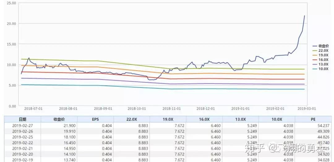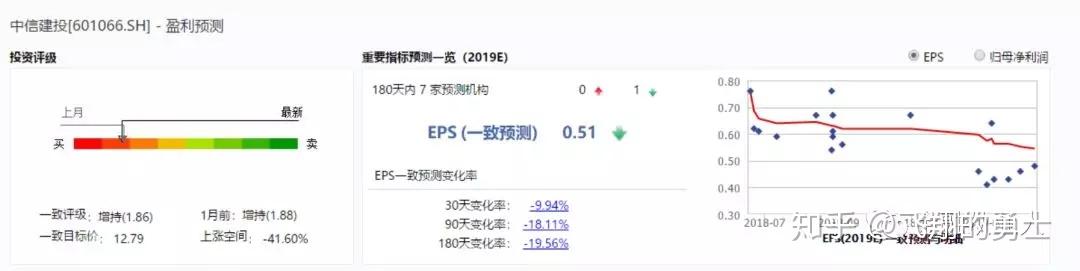 仍以中信建投为例,2018年分析师一致预期EPS为0.51,所以2018年2月28日对应的2018年动态市盈率=21.90/0.51=42.94倍。