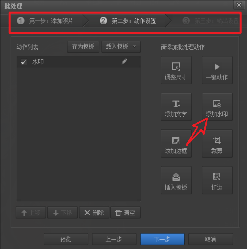 对了,它还支持批量一键操作,比如可以批量上水印,选择【批处理】-【添加照片】,然后在动作设置里选择【添加水印】即可。