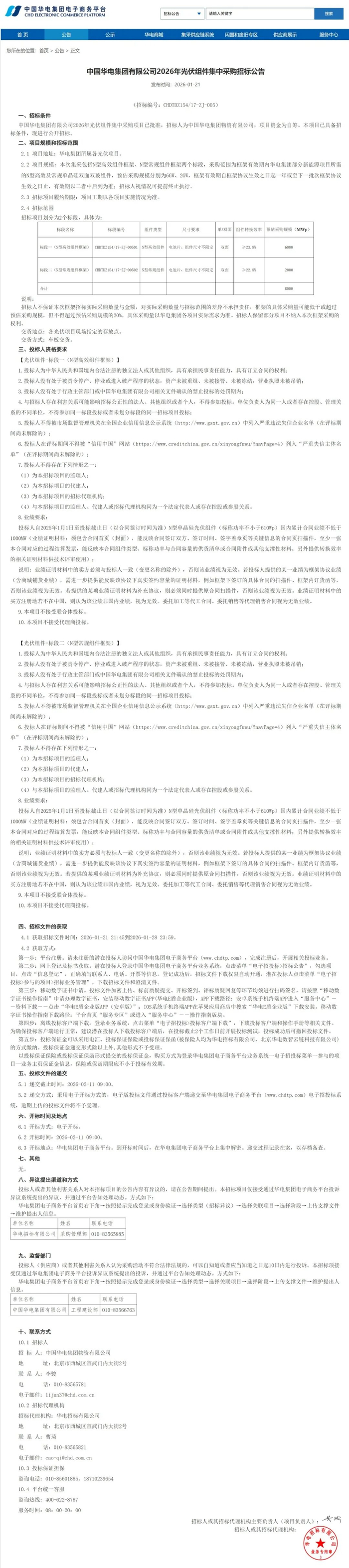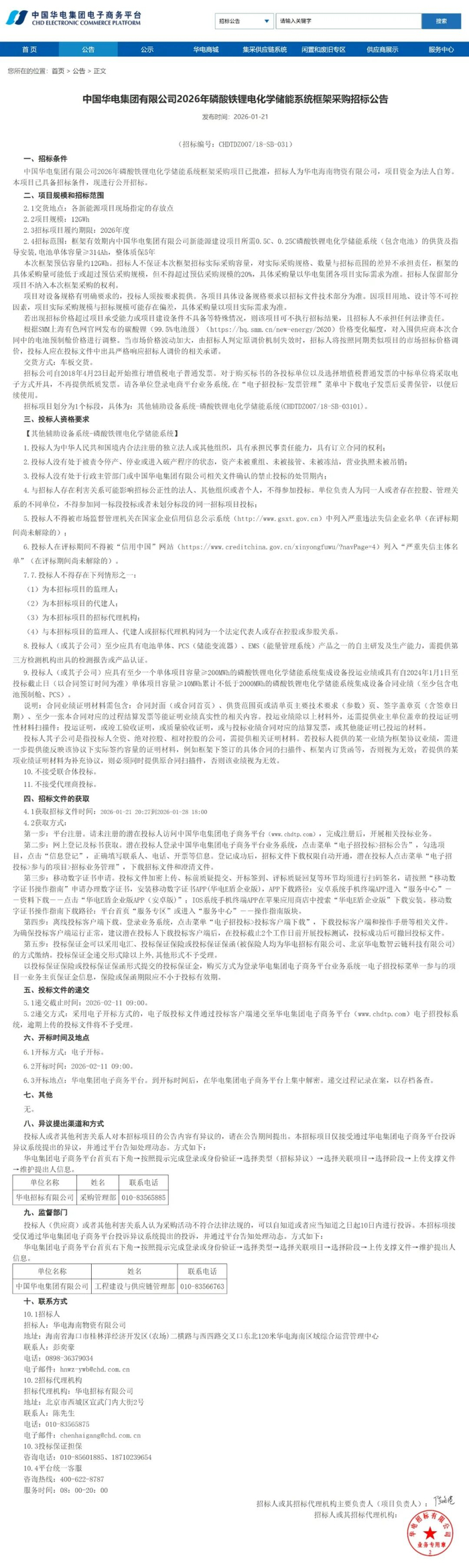 1月21日,中国华电集团有限公司发布2026年光伏组件、磷酸铁锂电化学储能系统招标公告。