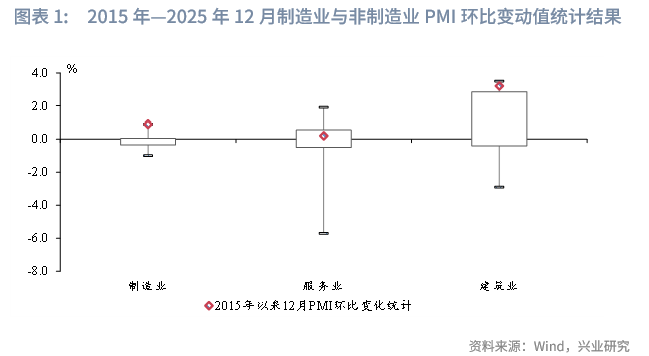 12月,制造业与非制造业景气均有不同程度回升。制造业方面,产需指数进一步改善,制造业逆季节性大幅回升至荣枯线上,这是制造业PMI自2025年4月以来首次回升至扩张区间。非制造业方面,在稳增长政策下建筑业环比处于季节性偏强水平,建筑业PMI重回荣枯线上。服务业在新订单改善提振下亦有小幅上行。