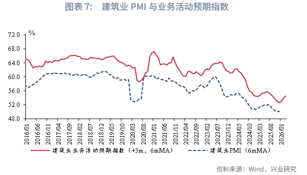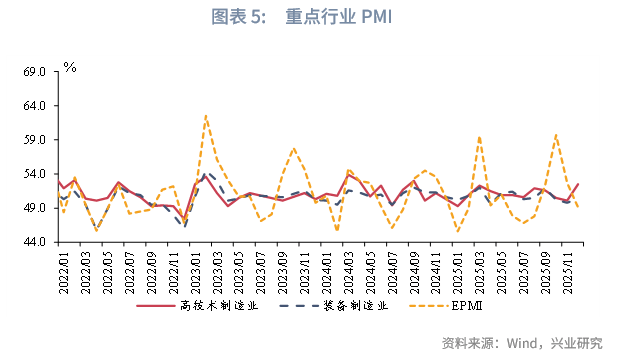 从建筑业看,受部分南方省份近期气温偏高,以及两节临近企业抢抓施工进度等因素影响,12月建筑业PMI较前月上行3.2个百分点至52.8%,这是建筑业PMI自2025年8月以来重回荣枯线上。在稳增长政策提振下,12月建筑业新订单PMI较前月上行1.3个百分点至47.4%。从预期看,12月建筑业业务活动预期指数较前月小幅回落0.5个百分点至57.4%。2025年12月31日,国家发改委召开新闻发布会表示,近日,发改委组织下达2026年提前批“两重”建设项目清单和中央预算内投资计划,共计约2950亿元,将加快各类资金拨付和使用节奏。同时,发言人表示国家发改委近期批复或核准多个重大基础设施项目,总投资超过4000亿元[3]。下一步,随着“两重”建设项目落地推进,建筑业PMI预计继续回升。