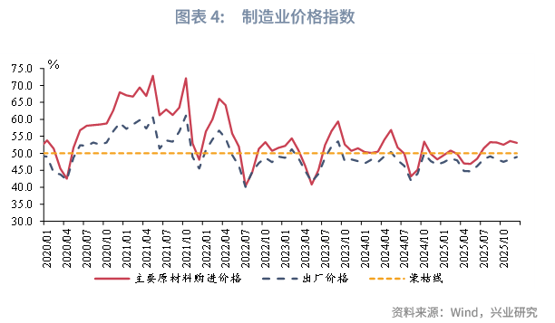 从价格看,12月主要原材料购进价格指数较前月回落0.5个百分点至53.1%,而出厂价格指数较前月上行0.7个百分点至48.9%。值得注意的是,出厂价格指数仍然处于荣枯线下,表明当前企业盈利仍然承压,仍需进一步整治“内卷式”竞争,遏制低价低质量竞争。