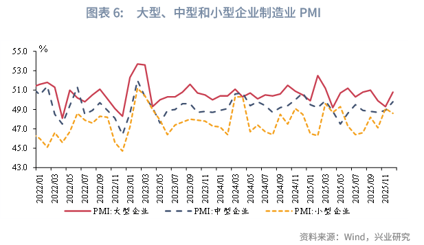 分企业类型看,12月大型企业PMI回升至荣枯线上。12月,大型、中型企业制造业PMI分别较前月回升1.5个、0.9个百分点至50.8%、49.8%。小型企业制造业PMI较前月回落0.5个百分点至48.6%。