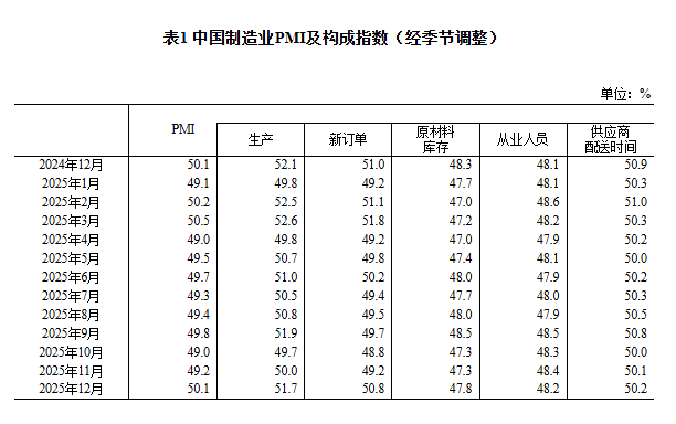 12月份,制造业采购经理指数(PMI)为50.1%,比上月上升0.9个百分点,升至扩张区间。