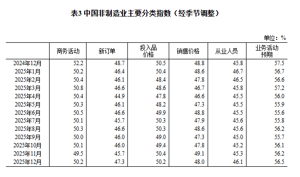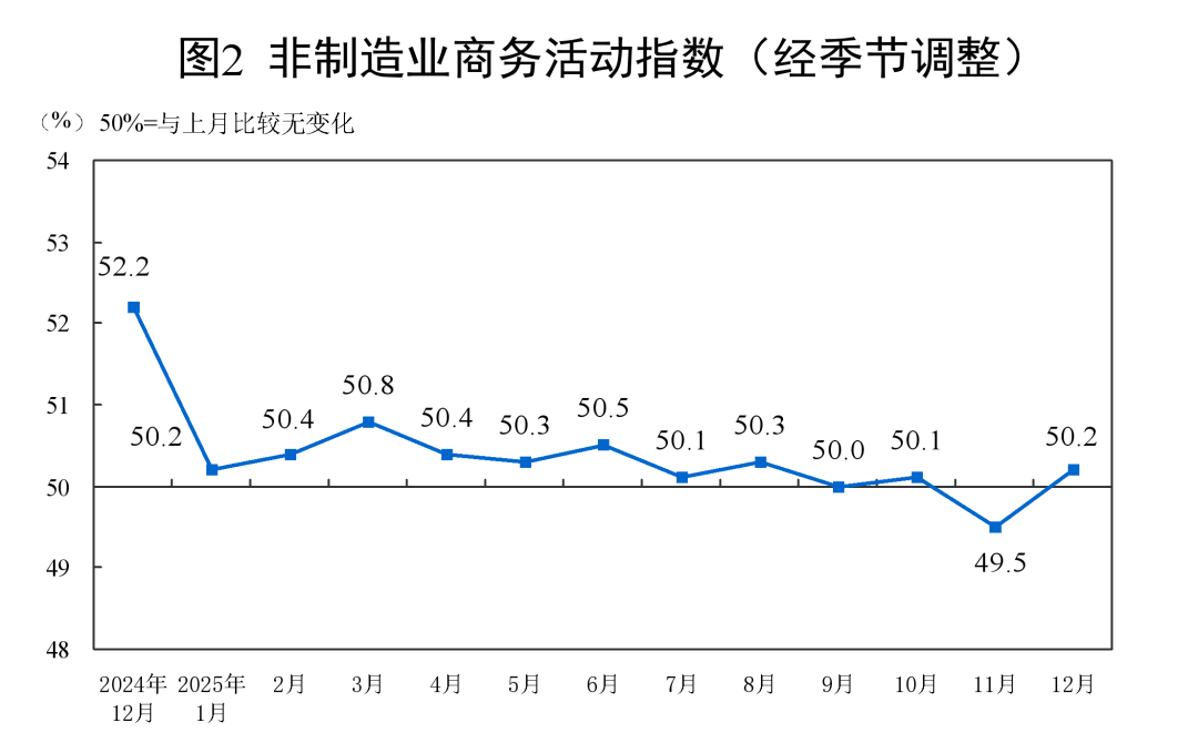 12月份,非制造业商务活动指数为50.2%,比上月上升0.7个百分点,重返扩张区间。
