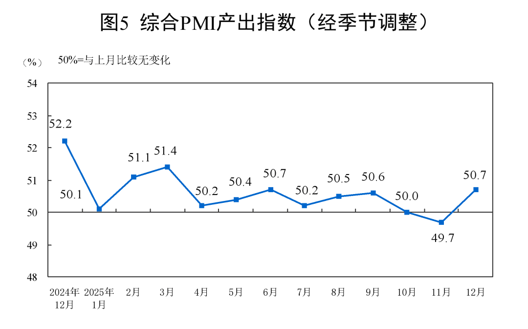 12月份,综合PMI产出指数为50.7%,比上月上升1.0个百分点,表明我国企业生产经营活动总体较上月扩张。