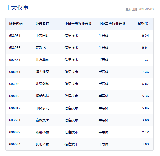 芯片50ETF(516920)跟踪中证芯片产业指数,截至1月6日,前十大成分股合计占比达57.21%!此外,芯片50ETF(516920)的管理费率为0.15%,托管费率0.05%,为芯片主题ETF中费率最低档的品种!