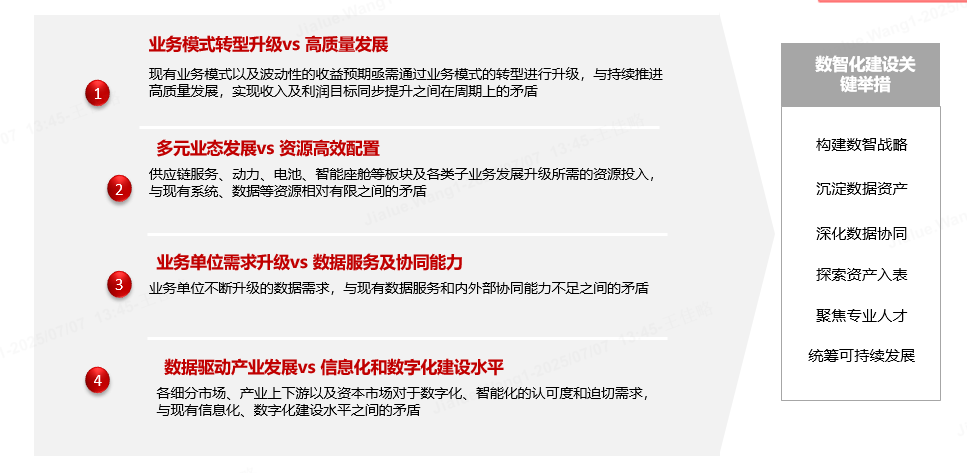 图2:数智化转型的主要矛盾与关键举措图在推进数智化转型进程中,吉利汽车集团识别并着力破解四方面关键结构性矛盾:一是业务数智化转型需求与当前营收增长压力之间的矛盾;二是多元化业态快速发展与信息资源优化配置不足之间的矛盾;三是业务端日益增长的数据需求与数据服务体系协同能力滞后之间的矛盾;四是数据驱动创新发展目标与现有数智化基础支撑水平不匹配之间的矛盾。