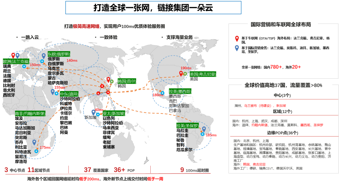 为应对全球化数据需求,集团大力投入建立星睿智能云底座,打造吉利集团全球一张网,链接集团一朵云,建立了3个中心节点、11个区域节点,并通过吉利卫星覆盖37个国家,实现流量覆盖超80%。建立服务全集团全业务场景的数智底座,支撑智算、智驾、试制、车联网等各类业务,支持业务智能、消费者智能、产品智能业务发展。