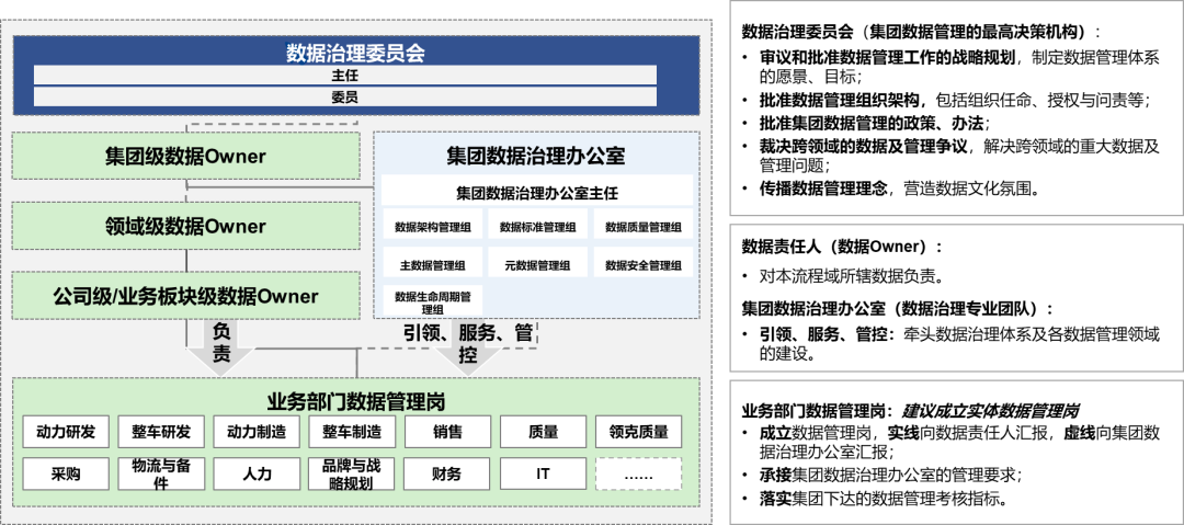 数据治理委员会是吉利数据管理的最高决策机构,由CDO担任委员会主任,各业务域一级数据Owner为核心成员,负责数据管理重要事项的决策。