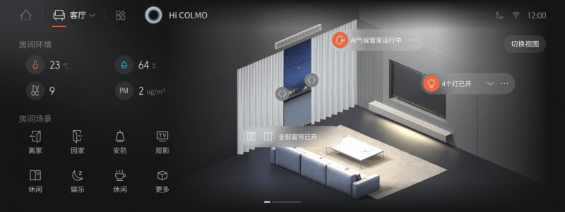 COLMO AI管家采集室内外空气相关数据,包含温湿度、PM2.5、二氧化碳、TVOC、甲醛等,依据用户偏好习惯,通过环境自适应调控算法,动态调用家中空气类智能设备,保持室内微气候的长久舒适。例如在潮湿的梅雨季节,COLMO AI管家会将室内温度始终控制在20℃、湿度控制在40%,让体感时刻保持清爽;新家刚入住,室内TVOC和甲醛浓度超标,COLMO AI管家将动态调用空气净化类设备,让室内空气质量始终稳定在健康状态;入睡前,用户只需轻轻说一句“HI COLMO,我要睡觉了”,卧室空气的温湿度便会自动调至最舒适的模式,安睡一整晚。