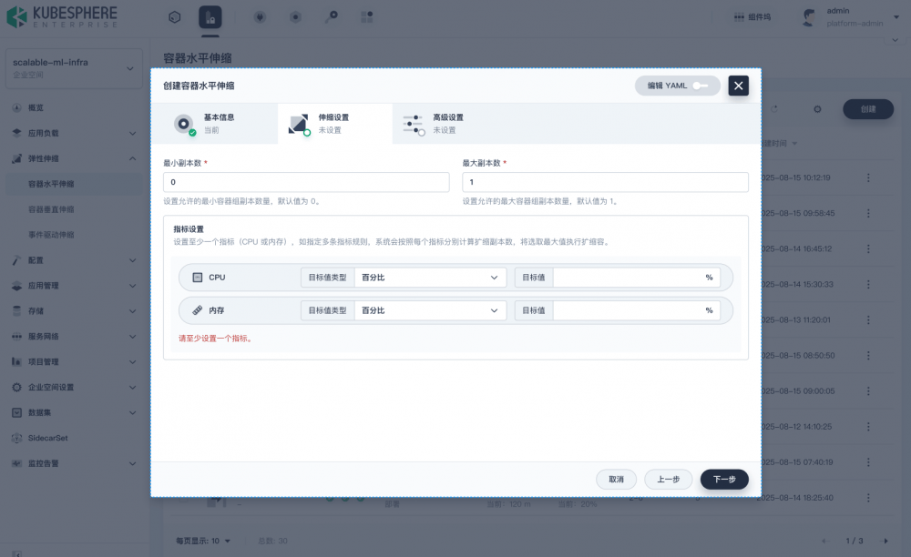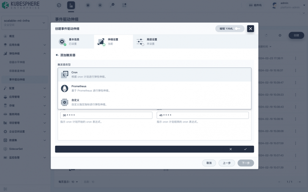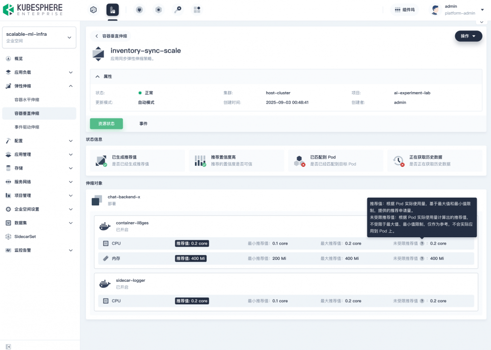 KubeSphere v4.2.1 通过集成垂直 Pod 自动扩缩(VPA)、事件驱动的弹性伸缩机制,并增强传统 HPA 策略,实现更精准、更敏捷、多维度的资源弹性调度能力。