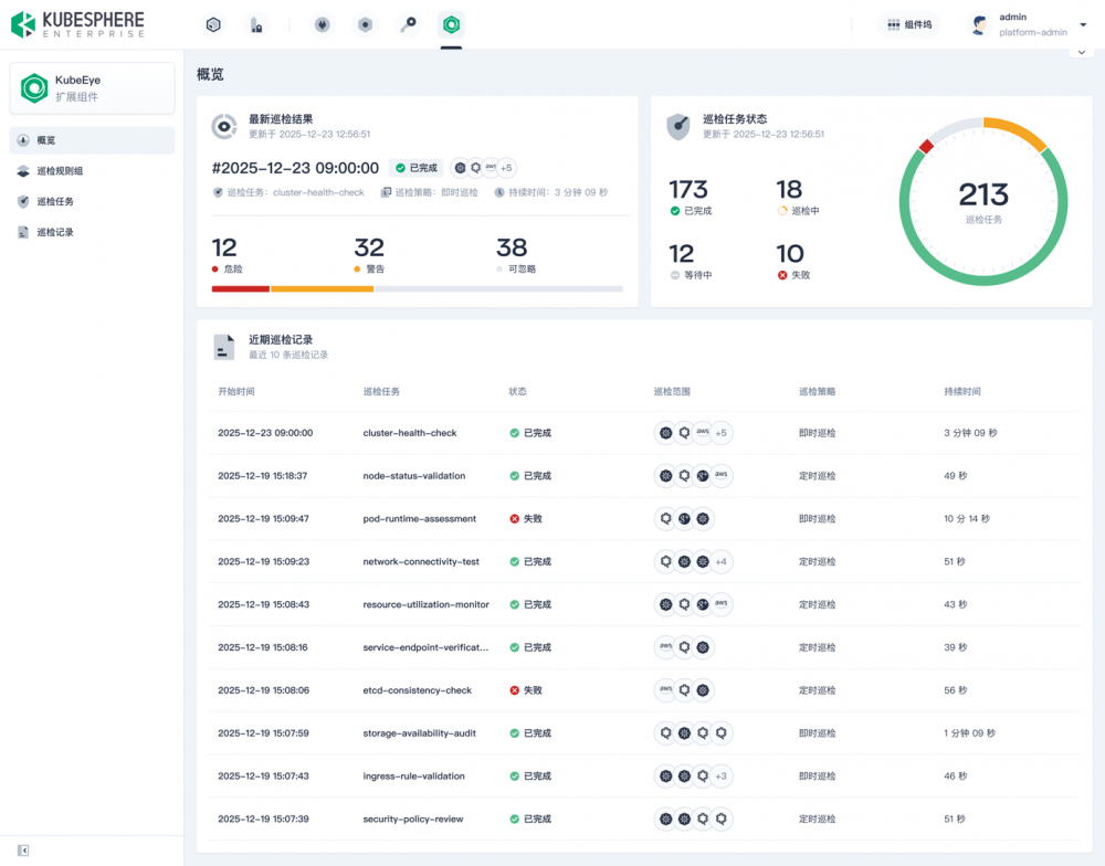 KubeSphere v4.2.1 通过 KubeEye 提供灵活且可扩展的 K8s 集群巡检框架。KubeEye 支持通过自定义巡检规则和计划,对集群中的节点、工作负载及服务进行全面的自动化健康检查与合规性扫描,并自动采集结果、生成详细的巡检报告,帮助管理员提前发现潜在风险与配置缺陷。