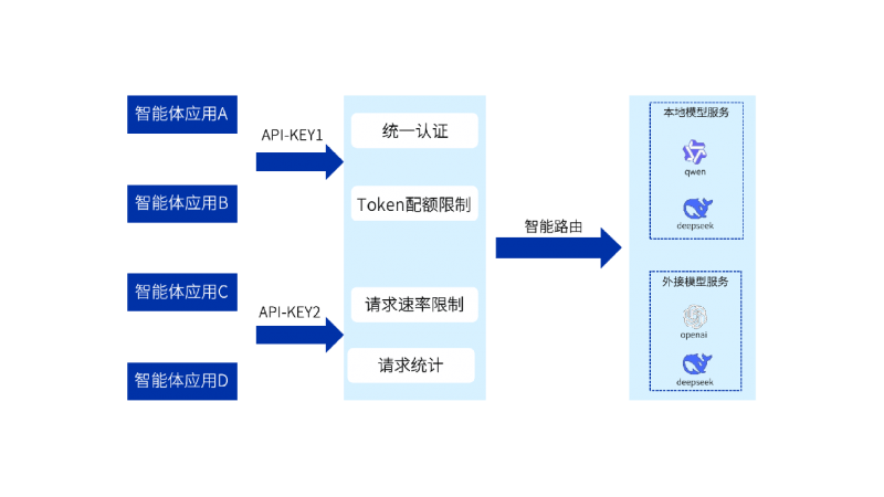 AI网关提供标准化API(兼容OpenAI协议),一站式接入本地模型与外部模型,实现“一个入口管所有模型”。