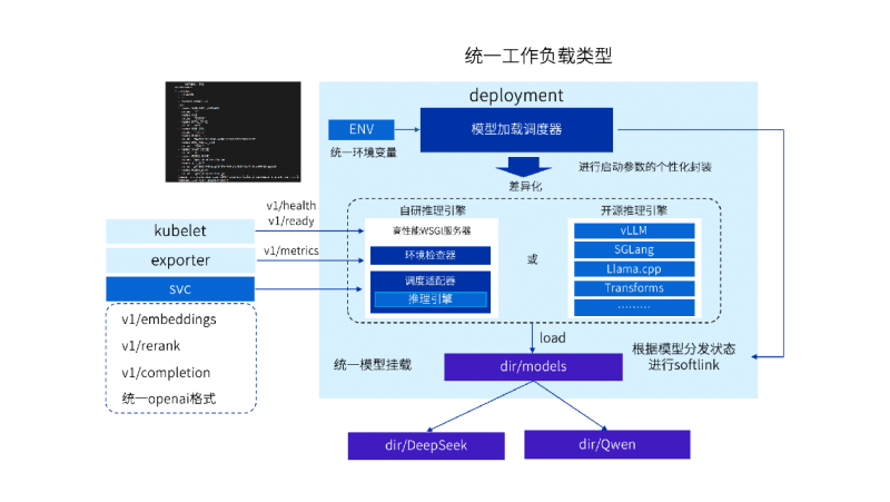 在K8s层面统一封装工作负载接口,自研模型加载调度器作为推理引擎启动的统一入口,提供模型文件分发状态判断、环境变量读取、启动参数配置、本地软链接创建等功能,彻底屏蔽各类推理引擎的参数差异,降低使用门槛。