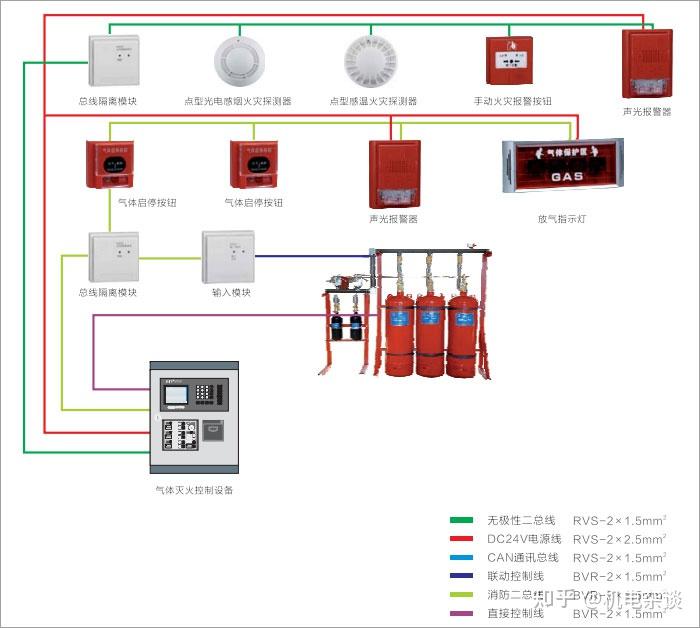 系统由气体灭火控制器、火灾声光报警器、气体喷洒指示灯、紧急启停按钮、手自动转开关等组成。气体灭火控制器独立成系统,也可与火灾报警控制器联网,接收其火灾报警联动信号。