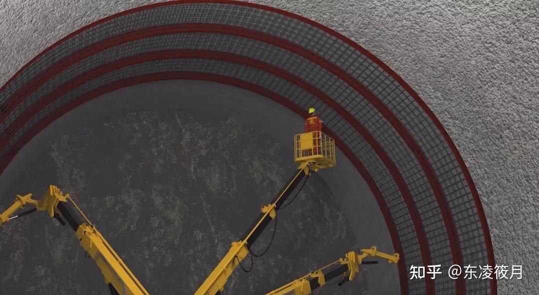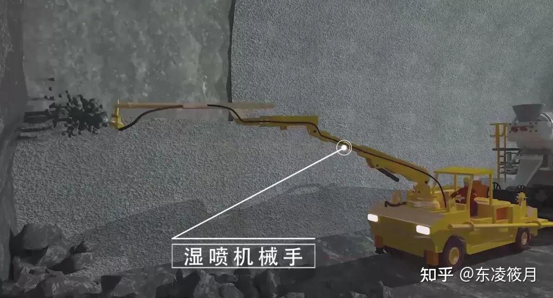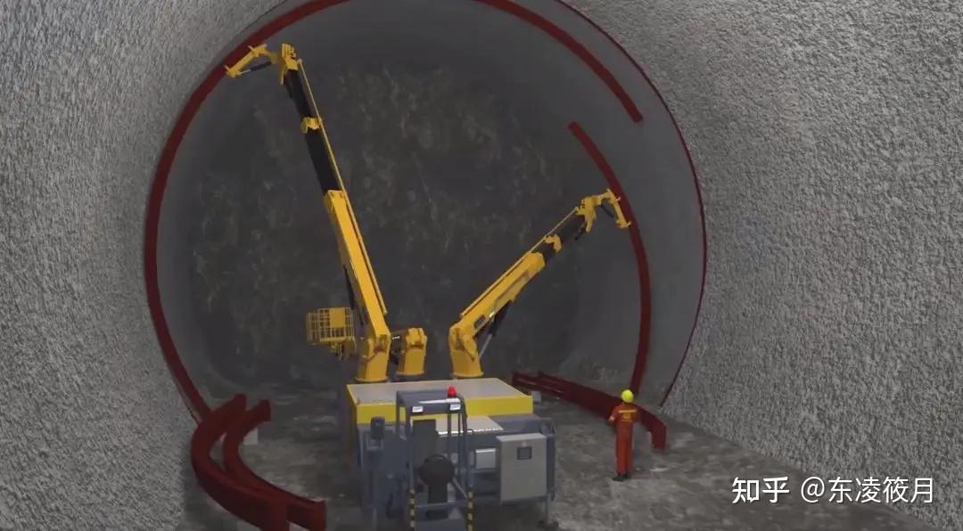 拱架安装后,混凝土湿喷机械手就该出场了。它主要负责初期支护混凝土的初喷与复喷,即保证了施工安全,又为后续施工做好准备。