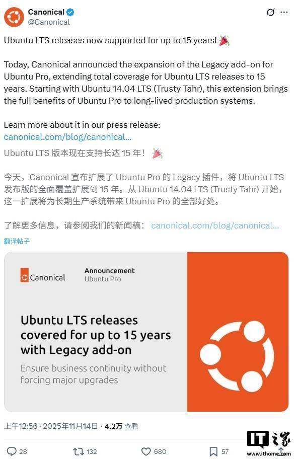 IT之家 11 月 16 日消息,Ubuntu 发行商 Canonical 于当地时间周四发布公告,宣布将通过 Ubuntu Pro 的 Legacy 附加组件,将 Ubuntu LTS 版本的支持周...