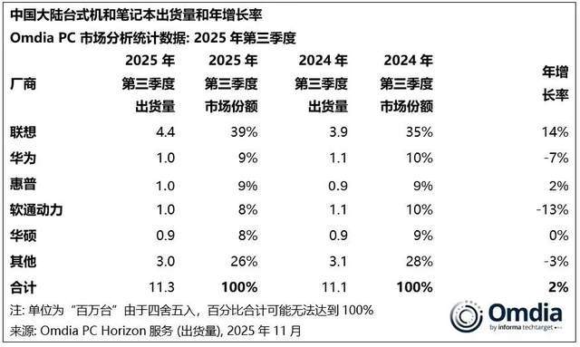 近日,有机构发布了2025年三季度,中国PC市场销量数据。 如下图所示,三季度中国一共销售PC(含台式、笔记本)1130万台,同比增长了2%,表现还算不错。 而前五名分别是联想、华为、HP、软通动力、...