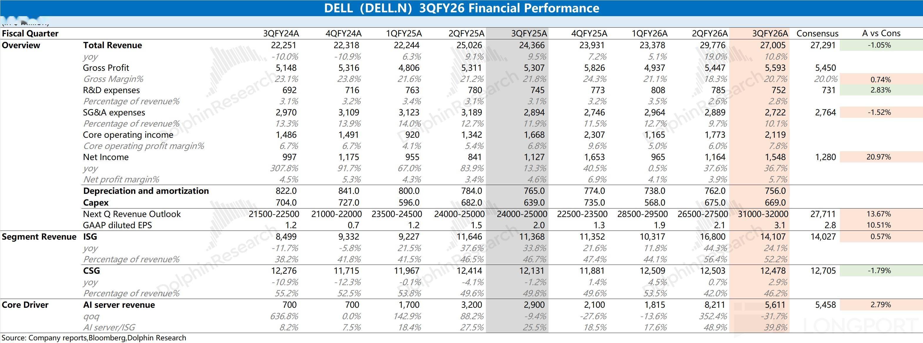 戴尔公司 (DELL.N) 北京时间 11 月 26 日凌晨,美股盘后发布 2026 财年第三季度财报(截至 2025 年 10 月): 1.核心业绩:$戴尔科技-C(DELL.US)本季度收入 27...