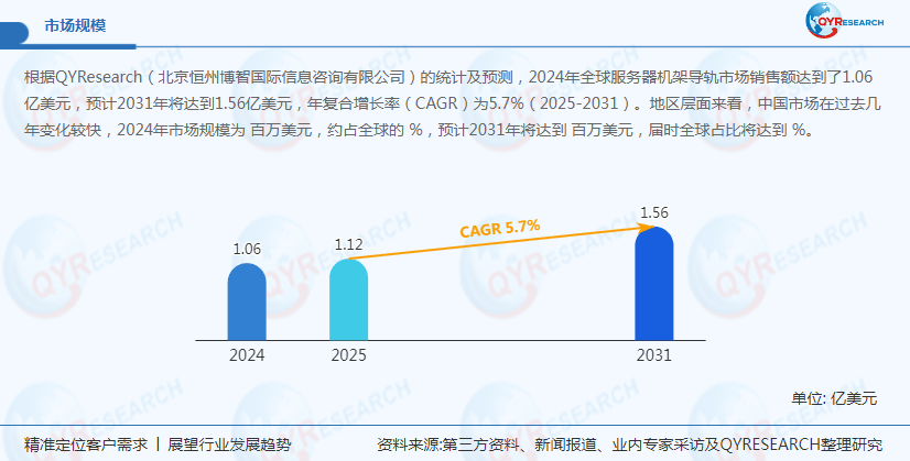据QYResearch最新数据显示,2024年全球服务器机架导轨市场规模达1.06亿美元,预计至2031年将以5.7%的CAGR增长至1.56亿美元。其中,亚太市场受数据中心建设加速驱动,2024年占...